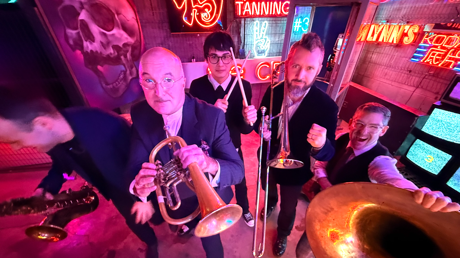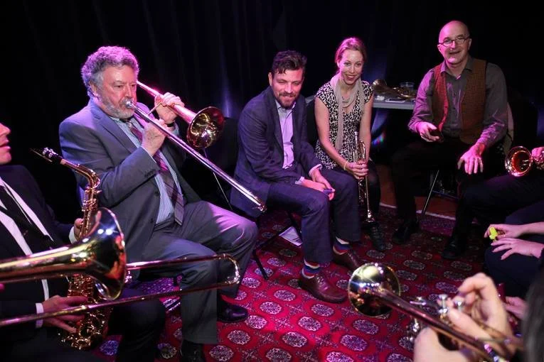 Rambunctious is an ever changing collective of horn players improvising dance party music, while I improvise lyrics. Seasoned veterans play alongside jazz school students or beginner amateurs of every age. Sometimes a 5-piece "cabaret act", sometimes a 15 or 20 piece explosion of good vibes; every show is a once-in-lifetime experience. We draw on the traditions of swing, ska, hip-hop, funk, disco and more. We get a title from the audience, decide a key and a form, then launch into a new song, complete with lyrics, harmonies, choruses, the lot. But be clear, this is not some experimental artistic exploration, it's a party.